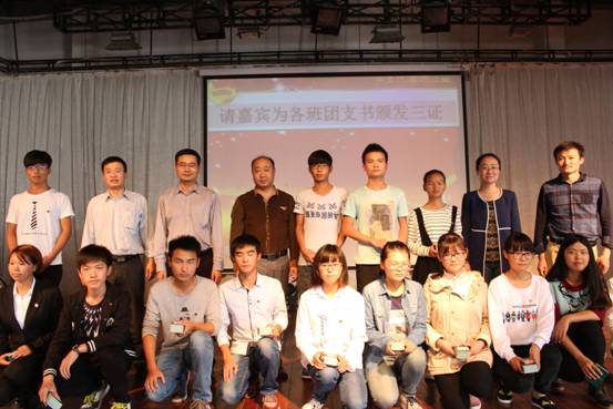 “三证”颁发仪式依照既定议程顺利进行。首先全体起立,奏唱国歌。四名新生着军训服装持团旗正步走上台,迎团旗,全体新生团员合唱中国共青团团歌。配乐诗朗诵《放飞青春》、一曲《光荣啊中国共青团》将大会推向了高潮。优秀员工代表丁淑琴分享学习经验。2015级各班团支书上台领取“三证”并与与会老师合影留念。最后,全体起立,重温入团誓词。